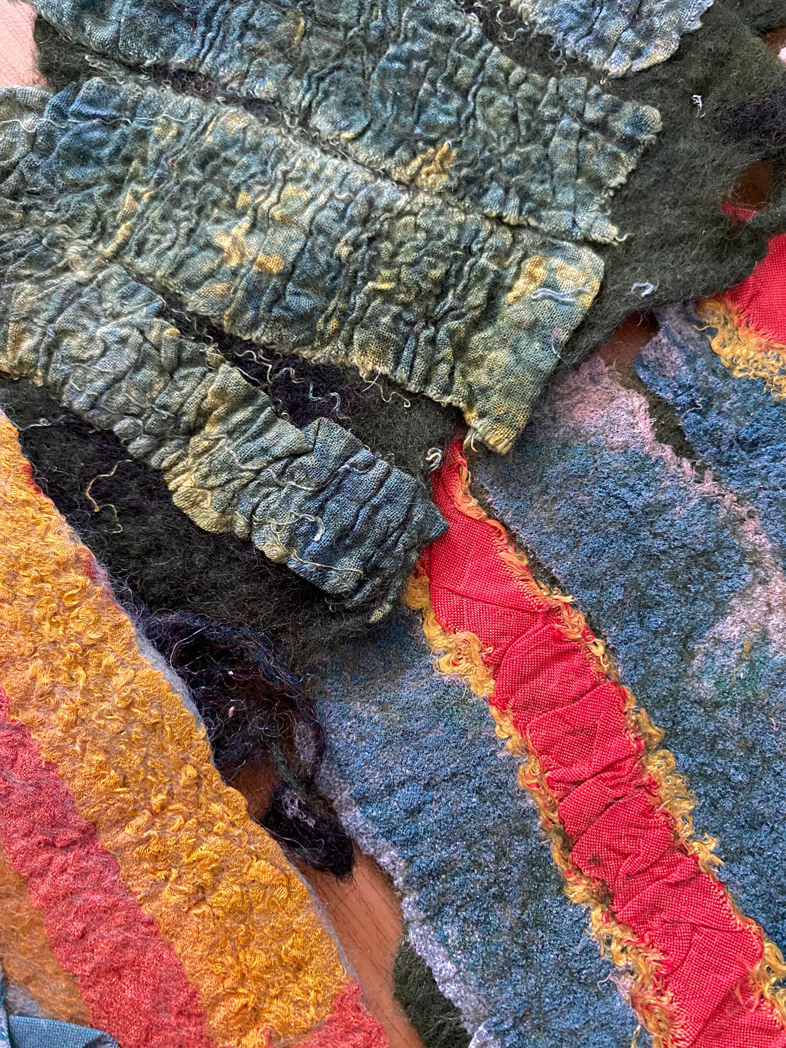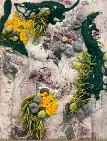 I work with many different materials and techniques mostly influenced by nature. I love dying and printing fabric and wool and enjoy making pieces that can be exhibited in a natural setting. My default material is often made on a knitting machine so that I can produce a range of textures and woven fabrics which can be collaged or made into 3D pieces.