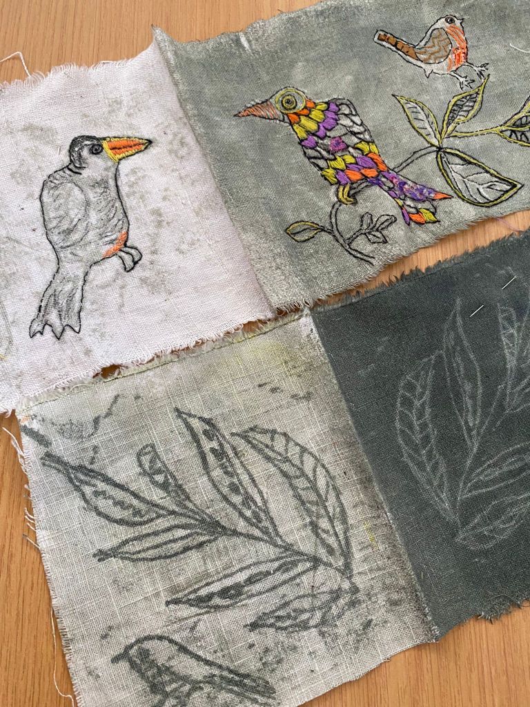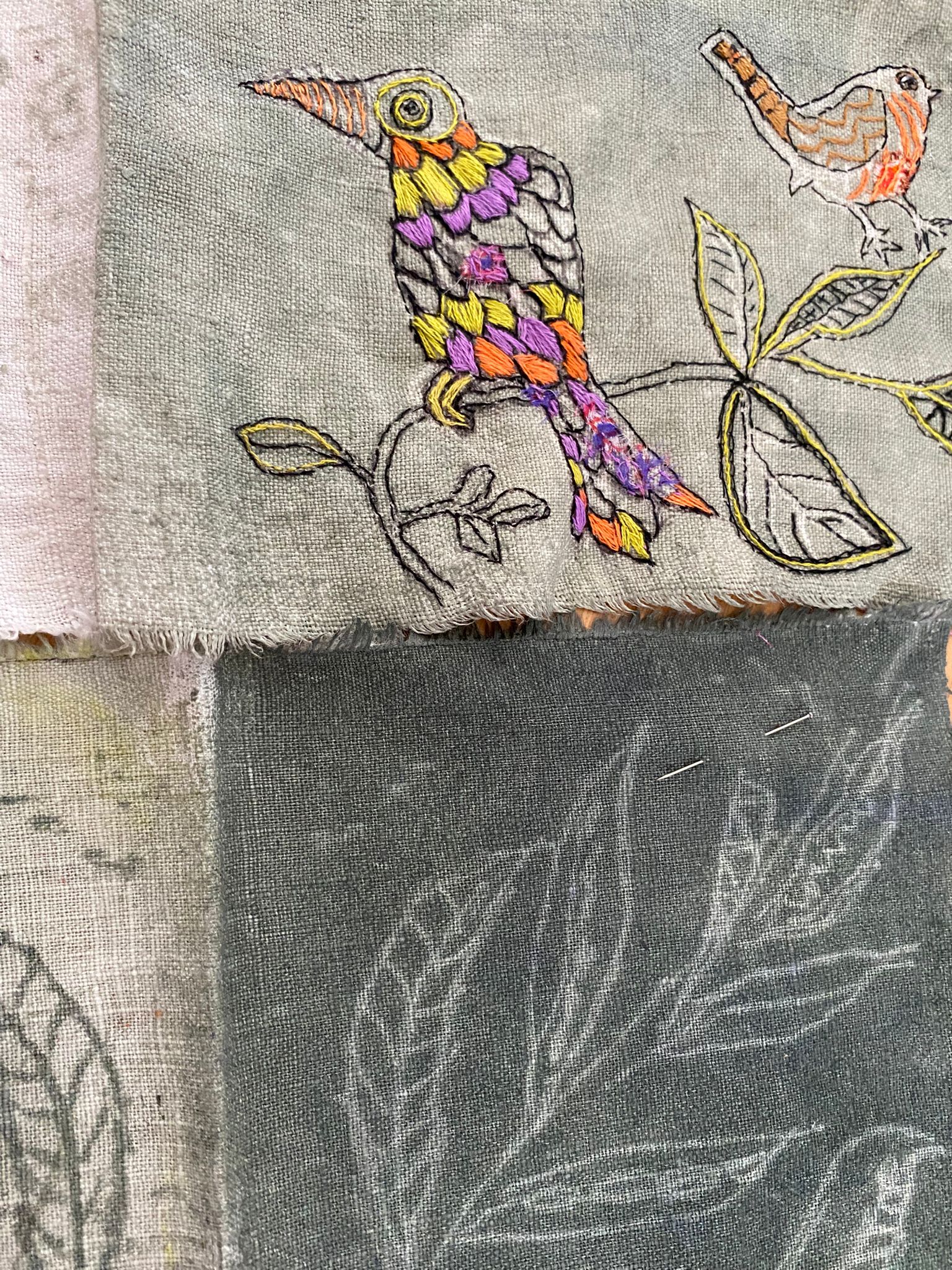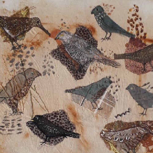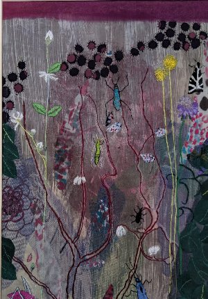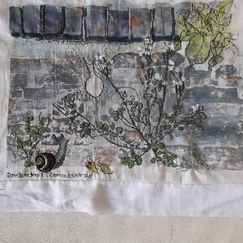 I grew up in the country in the decades after WW2 when climate change and species loss were not of concern. I loved drawing and painting the plants and creatures all around. The urge to keep recording these has been strengthened by their impending loss and continues to preoccupy me. I’m drawn to the detail of nature – weeds flourishing in the cracks of pavements, the pattern on a bird’s wing, the imprint of wet leaves on a pavement, a snail making its way up a wall. I often combine print with collage and stitch to realise these images.